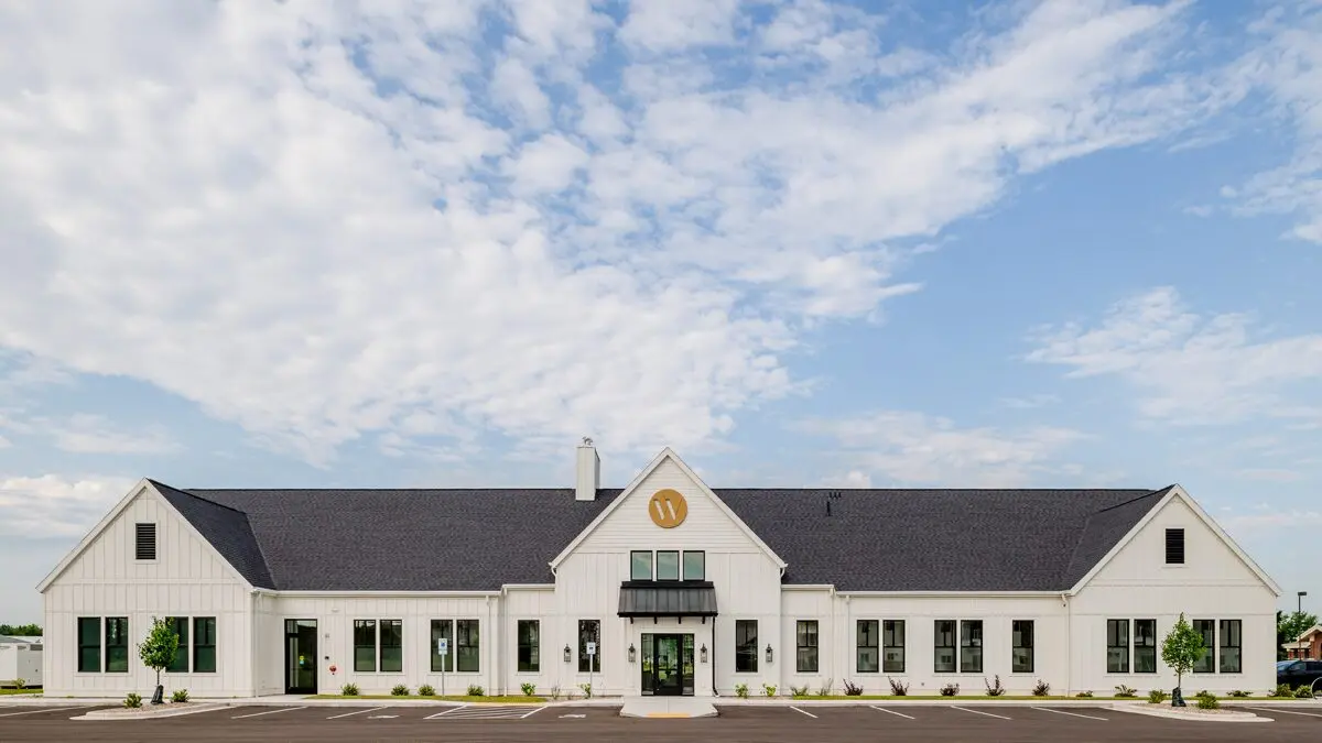 The interior was gutted to the bones and rebuilt to meet the Owners’ vision. Existing 1st and 2nd story rooms were removed to accommodate a soaring clerestory lobby. A grand staircase was added to connect the lobby and waiting room. Reclaimed lumber from a 19th century Jim Beam whiskey barrel storage building, a Kentucky equestrian center and vintage Wisconsin barns were converted into faux beams, columns, trusses, trim, accent walls, and flooring. The building was expanded to accommodate exam and laboratory spaces. A solarium was safely excavated, reinforced, and constructed to bring natural light into the lower-level employee break room. Exterior brick was stained, and LP Smart Siding added to create the desired “vintage contemporary” appearance. We worked collaboratively with adjacent businesses to reroute traffic flow and ensure adequate parking during construction so there were no disruptions to their daily operations.